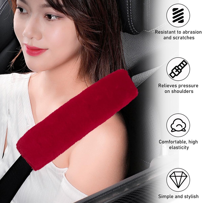 Gasedin 2 PCS Car Seat Belt Covers Shoulder Pad, Soft Synthetic Wool Sheepskin Seat Belt Shoulder Pad, Warm & Fluffy Seat Belt Cover for Comfortable Driving, Car Accessories (Wine Red)