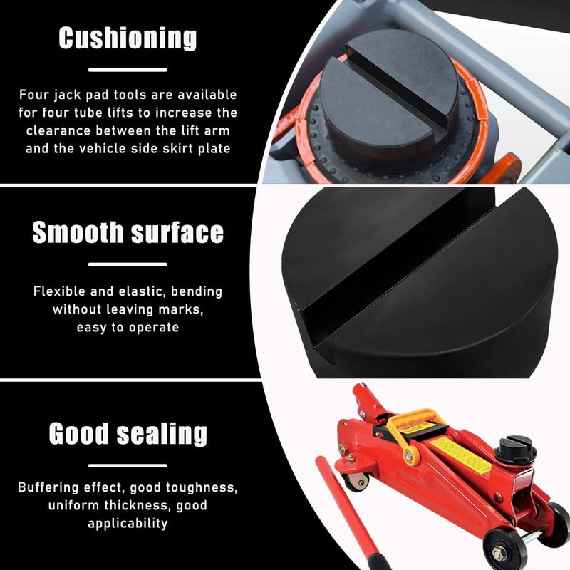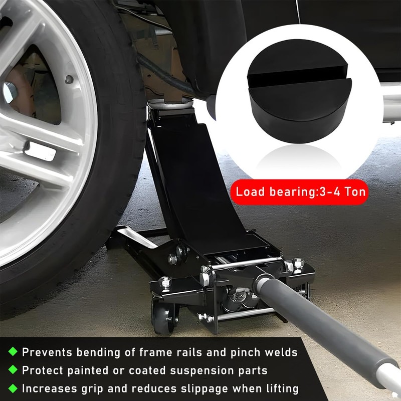 - 【Cushioned Protection】: These jack pads create a cushioned barrier between your vehicle and the jack, avoiding potential damage from metal-on-metal contact. Such a protective layer helps maintain the integrity of your vehicle's undercarriage, minimizing the risk of dents or scratches during lifting.