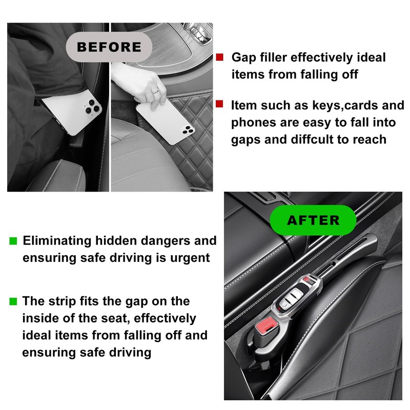 - 【Upgrade Car Gap Filler】: The car side seat gap filler uses a specially designed groove. Not only can it fill the seat gap to prevent small items from falling, but it can also effectively utilize the gap between the seat and the center console to add extra storage space to the car. Your keys and mobile phones will be within reach.