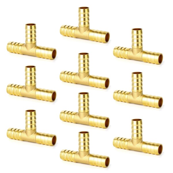 GASHER 10 Pieces Brass Hose Barb Tee, 3-Way Tee Hose Fitting (3/8" x 3/8" x 3/8" Hose Barb)