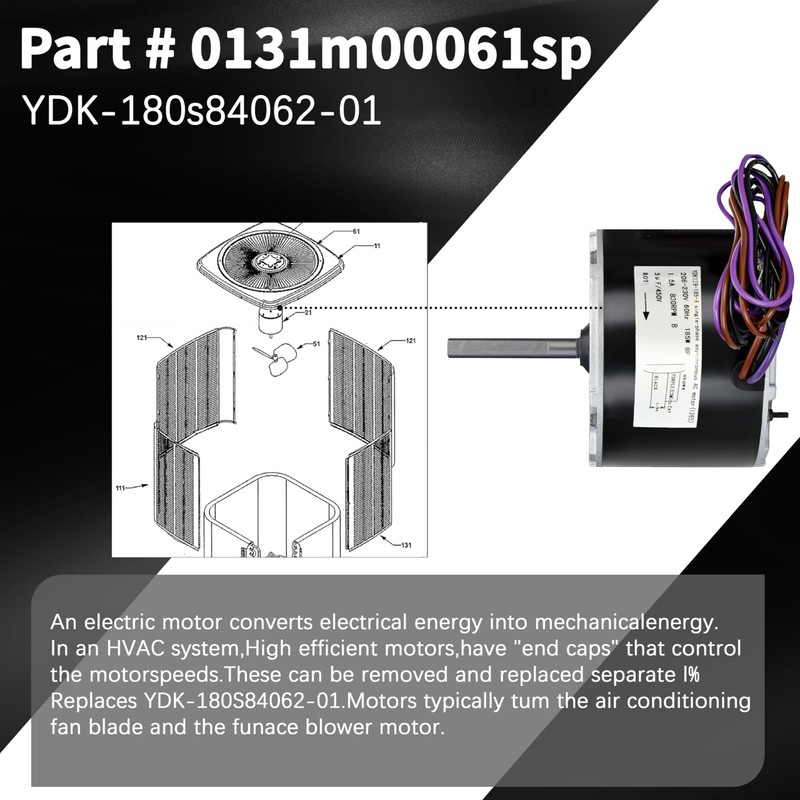 6:Function:An electric motor converts electrical energy into mechanical energy. In an HVAC system, motors typically turn the air conditioning fan blade and the furnace blower motor. High efficient motors, have "end caps" that control the motor speeds. These can be removed and replaced separately. for YDK-180S84062-01.goodman amana fan motor 0131M00014PS, for Zhongshan Broad-Ocean YDK-180S84062-01. This condenser fan motor (part number 0131M00061S) is for central air conditioners, 3 wire motor, permanently sealed and does not need lubrication.