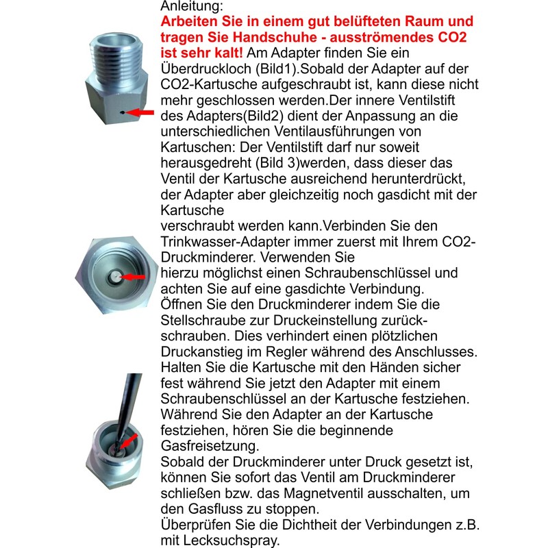 Please note: once the adapter is screwed onto the CO2 cartridge, it can no longer be closed. Therefore, always connect the drinking water adapter to your CO2 pressure regulator first gas-tight. Use a wrench if possible and pay attention to a secure seal.