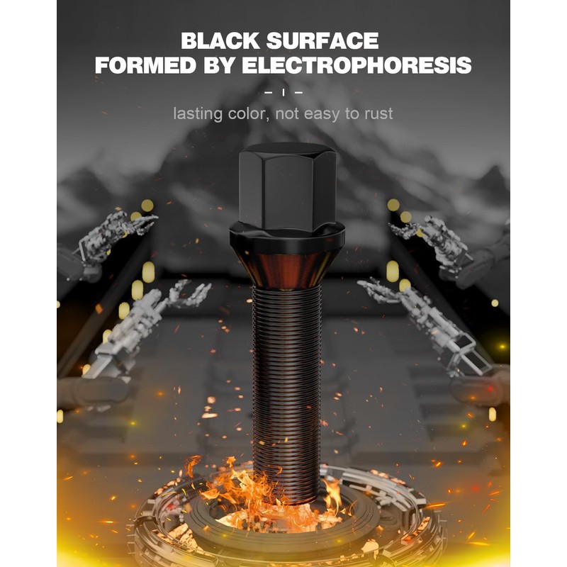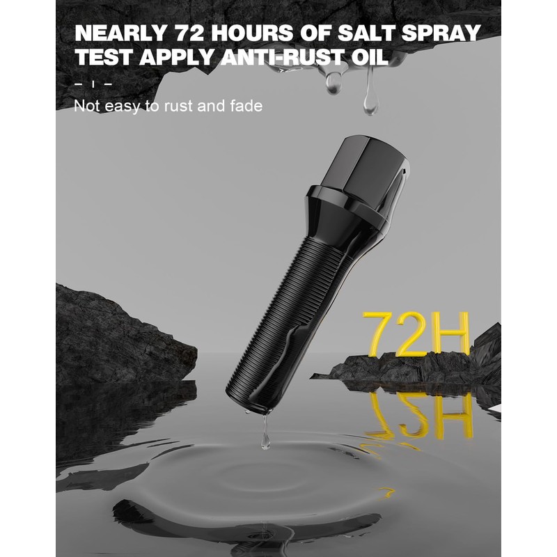 - Features- Our black wheel lug bolts are made of high-quality steel. After Four-layer plating and 72 hours of salt spray test, apply anti-rust oil. Not easy to rust and fade