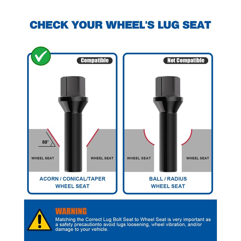 - Note - Check vehicle lug bolt size, seat, and thread. Check the bolt thread size of your vehicle as bolt sizes vary from year to year/model. These are Conical seat bolts. Make sure your wheel bolt seat has this seat type. If you have any questions, please feel free to contact us