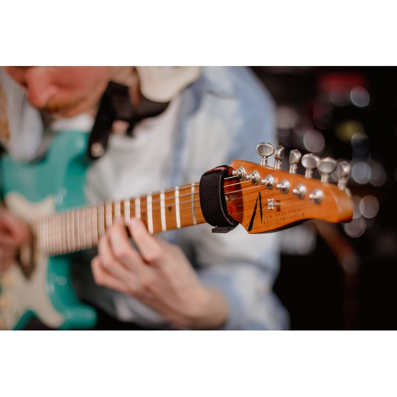 - Suppresses overtones and sympathetic resonance of open strings during various tapping techniques or general play