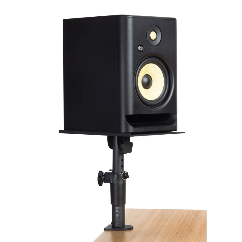 The desktop studio monitor clamp-on stand pair by Gator Frameworks supports most small-sized studio monitors in both vertical and horizontal orientations to improve speaker performance during playback and mixing. These stands function by separating and elevating speakers from your desktop surface, giving you a more isolated audio response for improved accuracy during studio monitoring. Easily adjust and lock the stand height from 10. 5” to 14” and speaker tilt angle from 0 to 15 degrees for preferred positioning. Clamps to Desktop Surfaces up to 2.25". Not suitable for glass surfaces.