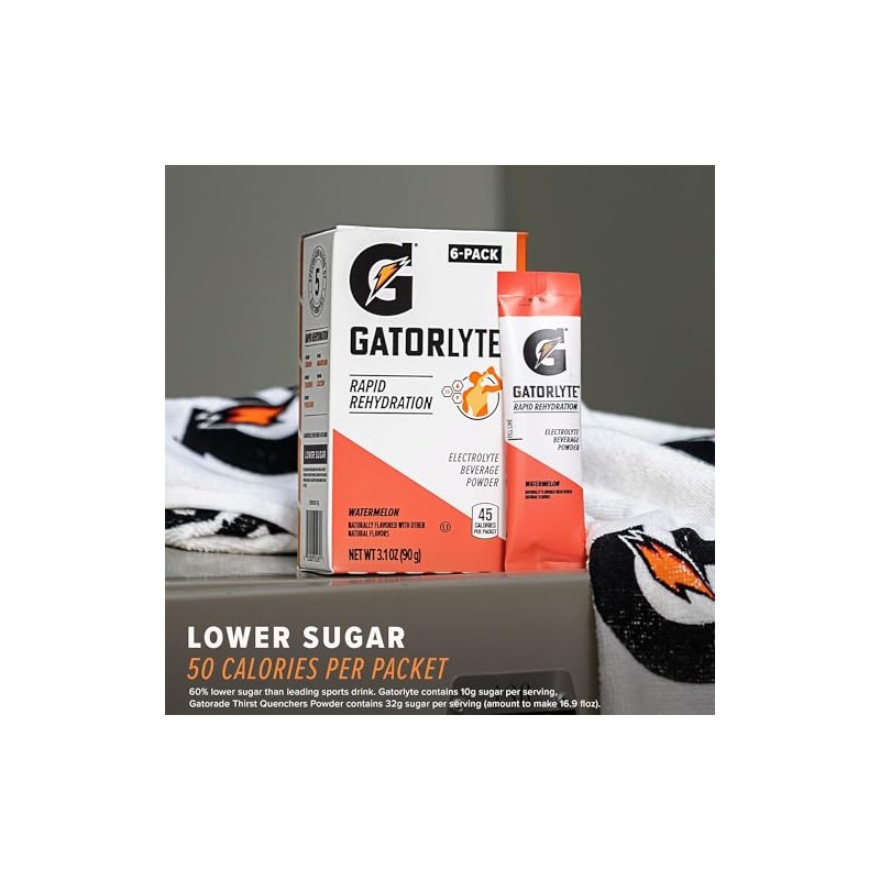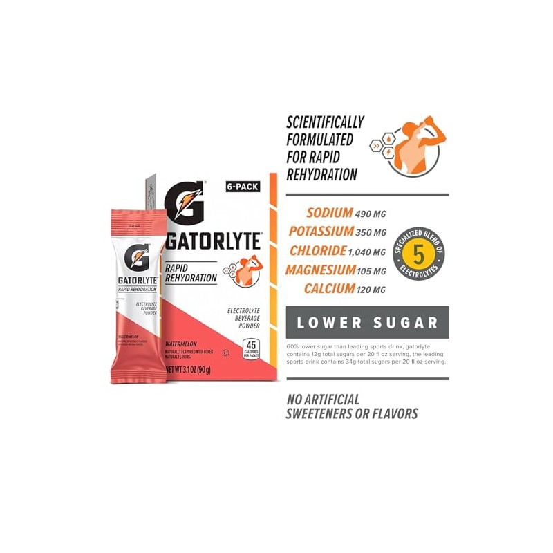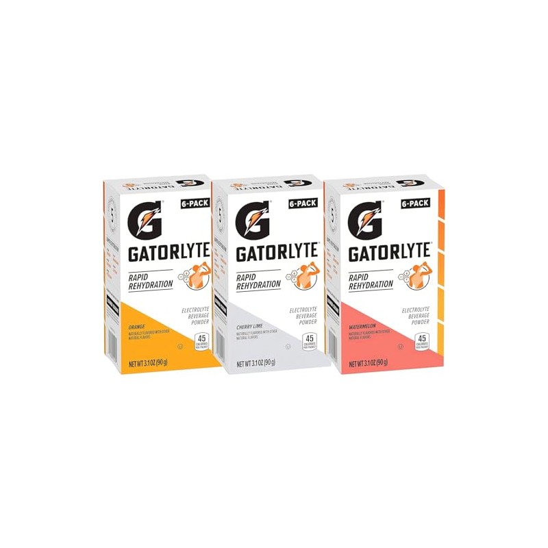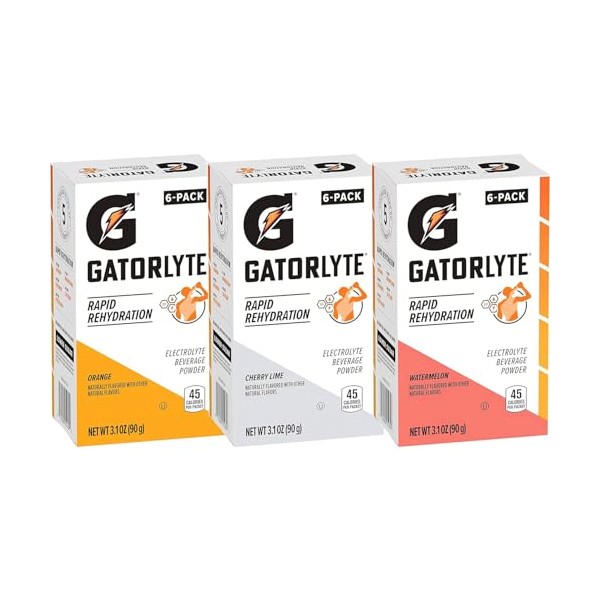 • Includes 18 sticks of Gatorlyte Rapid Rehydration powder, each stick makes 16.9 oz (500ml) of Gatorlyte: Orange, Cherry Lime, and Watermelon flavors