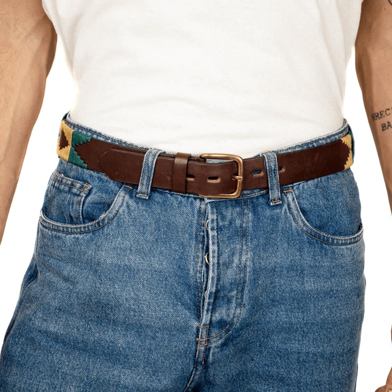 Traditional hand-stitched gaucho belt made from world-class Argentine leather. Made from scratch using the best quality materials - Unisex Model - Brown cow leather - Width: 1.38" - Hand-stitched in tan and green waxed thread.