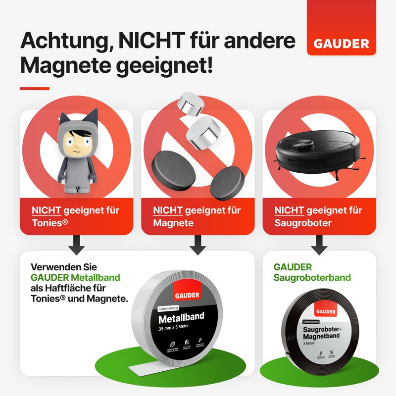 - Instructions for use: this magnetic tape is not designed for attaching Tonies, other magnets and magnetic tapes - use our GAUDER metal tape instead.