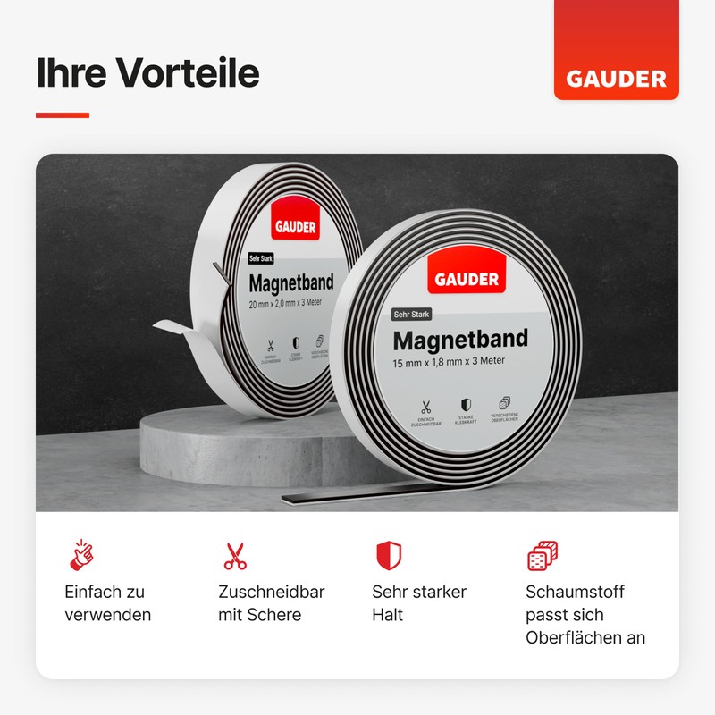 Simply cut our magnetic adhesive strip into self-adhesive magnetic strips with scissors. Not only are these magnetic strips self-adhesive, strong and individually selectable in their size, they also hold reliably on many surfaces thanks to the foam adhesive. Whether on wood, cement, tiles or other textures, GAUDER magnetic tape can be attached almost anywhere.