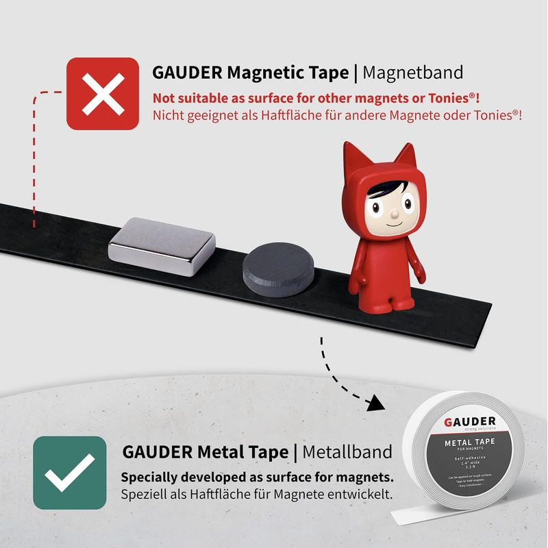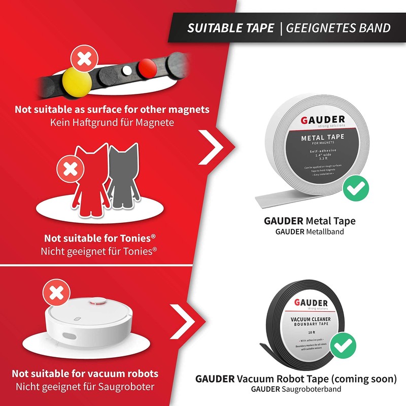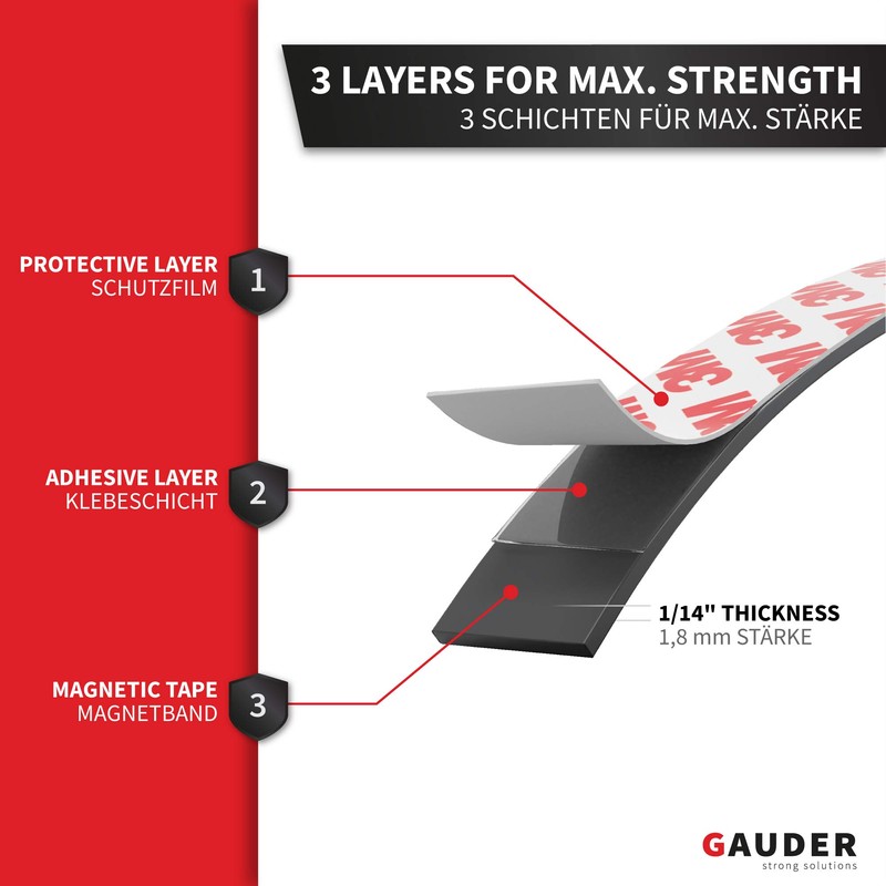 - STRONG ADHESION – Your GAUDER magnetic strips are covered with a special protective foil. This ensures that the adhesive backing of the magnetic tape roll has great durability and firm hold.