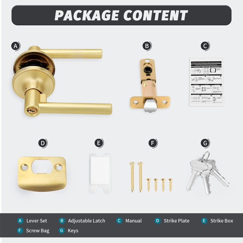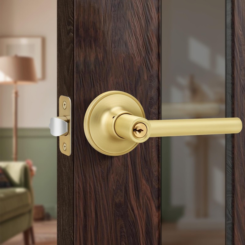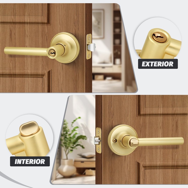 Gaurqiah Brushed Gold Keyed Entry Door Handle, Round Design Door Lever with Keys, Reversible Door Lever for Entrance Front Bedroom, Satin Brass