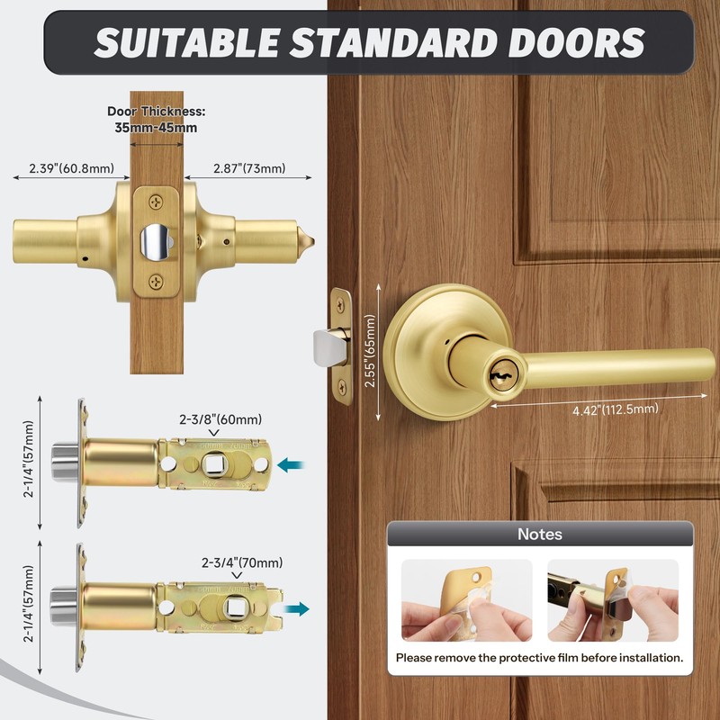- {REVERSIBLE HANDLE} Entrance door lever is reversible and can be installed left or right handed. The latch is adjustable between 2-3/8 in (60 mm) or 2-3/4 in (70 mm). Fit doors from 35-45mm (1-3/8 inch to 1-3/4 inch) thickness.