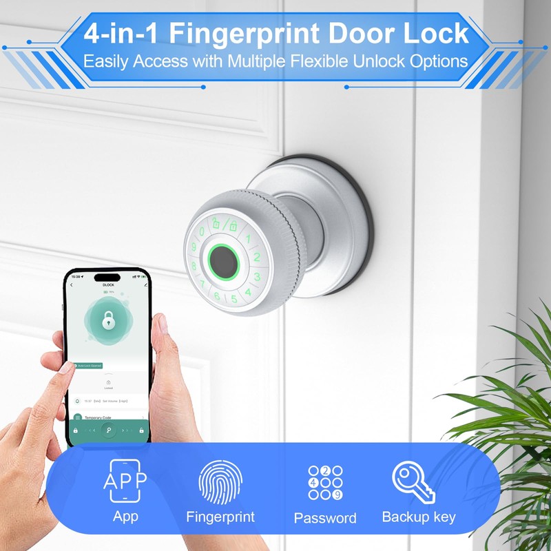 • 4-in-1 Ultimate Unlocking Options: Enjoy easy access to your home with a smartphone app, fingerprint scan, numeric code, or traditional key. The finger print door knob provides peace of mind with its reliable security features.