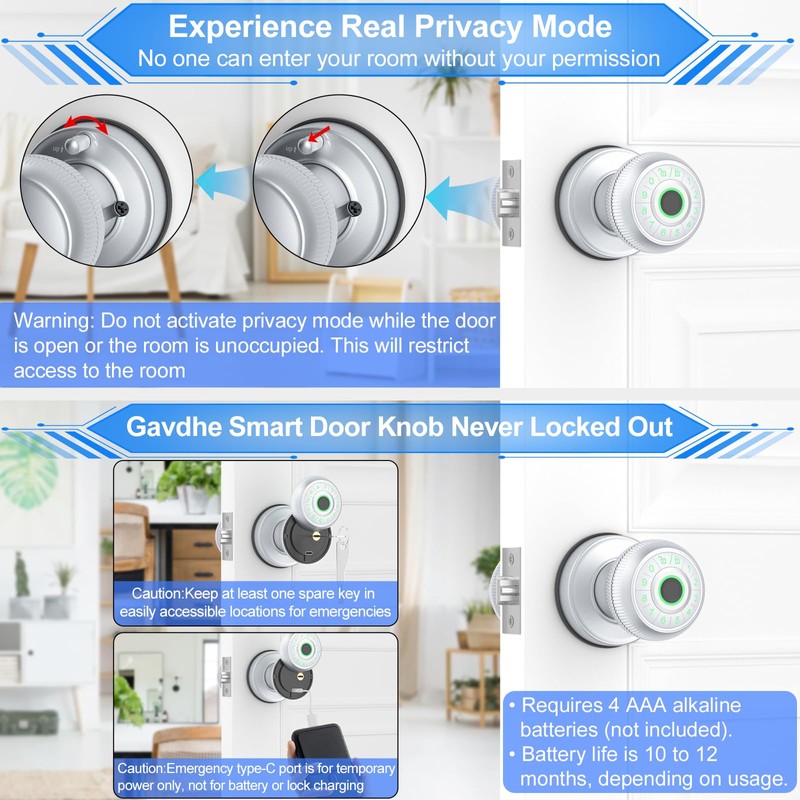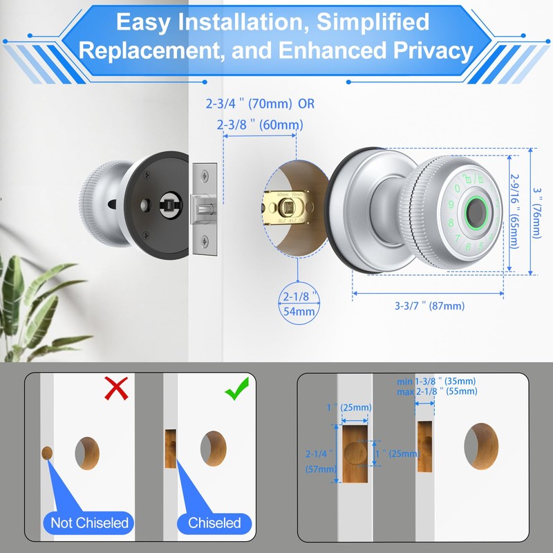 • Easy Installation with No Lockout Worries: This keyless entry door knob installs effortlessly on standard U.S. doors, featuring an adjustable deadlatch (2-3/8" [60mm] or 2-1/8" [70mm]) and accommodating door thicknesses from 1-3/8" [35mm] to 2-1/8" [55mm]. It boasts a 10-12 month battery life with 4 AAA alkaline batteries (not included), plus backup keys and an emergency Type-C port for temporary unlocking.