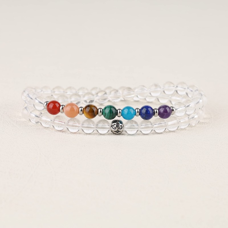 - Balancing chakra bracelet: 6 mm rock crystal, 7 chakra stones (red agate, sunstone, golden tiger eye, malachite, apatite, lapis lazuli, amethyst), 4 x 2 mm stainless steel space beads and 6 mm stainless steel OM pearl