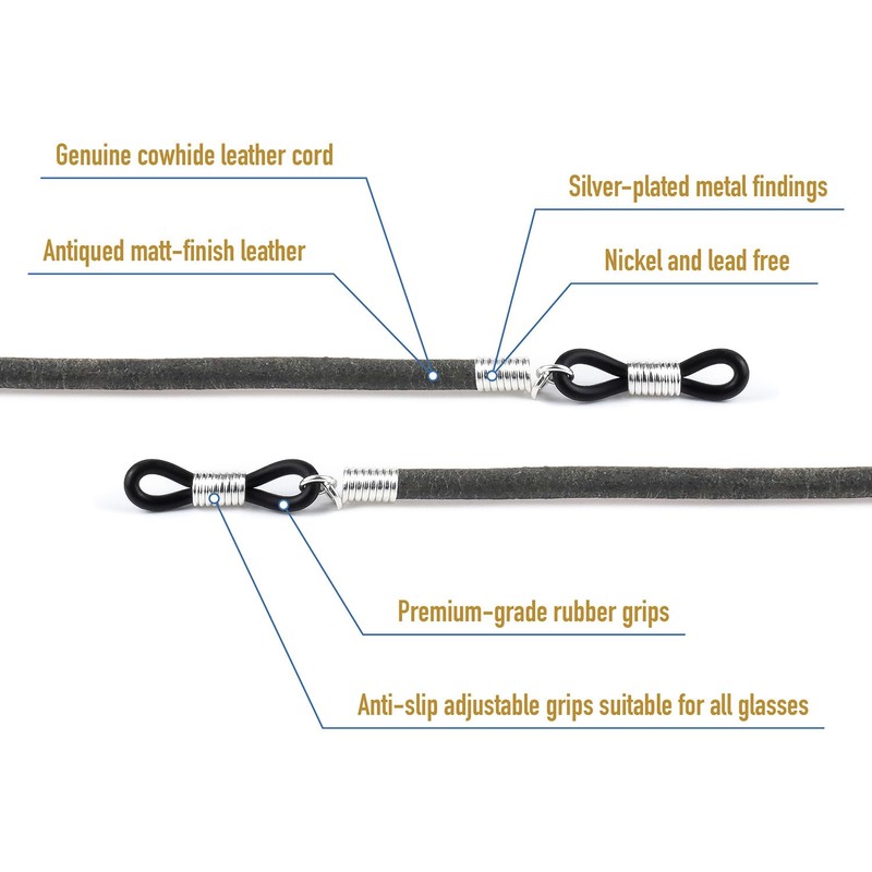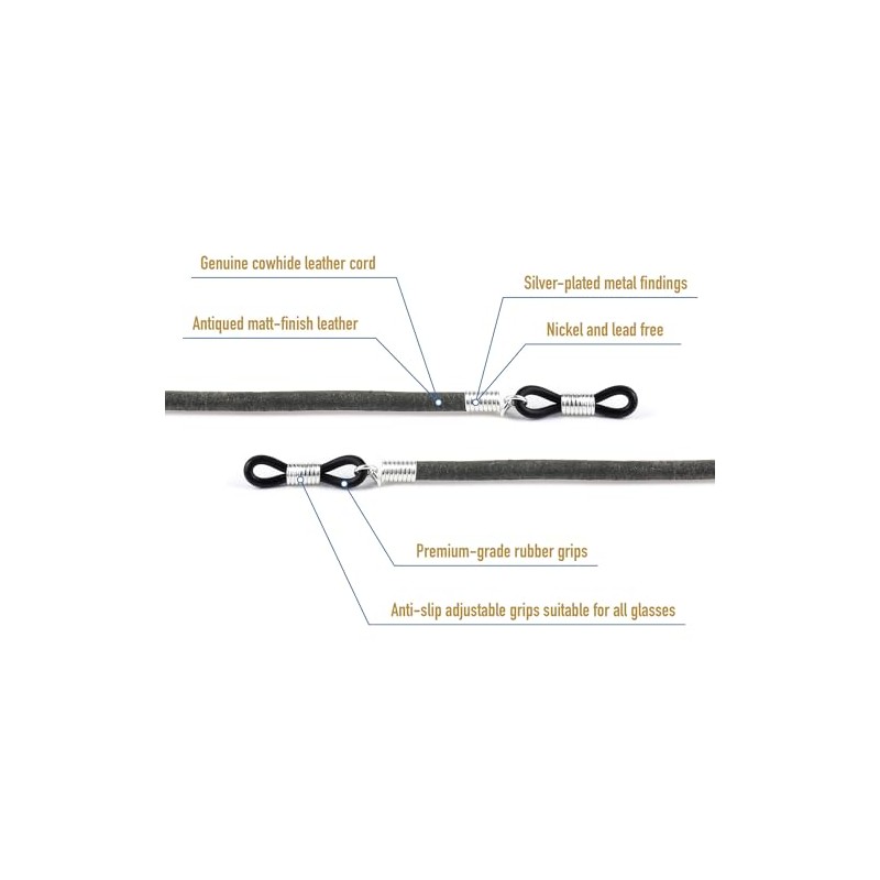 Beautiful hand-made glasses cords made with antique finished real leather cord and silver-plated findings. Keep your glasses safe in style with this robust and secure spectacle chain. Assembled and quality assured in the UK with high quality components. The non-slip rubber grips can be adjusted to fit all glasses and will hold your glasses securely, without loosening over time. Available in 3 colours, black, brown and tan.