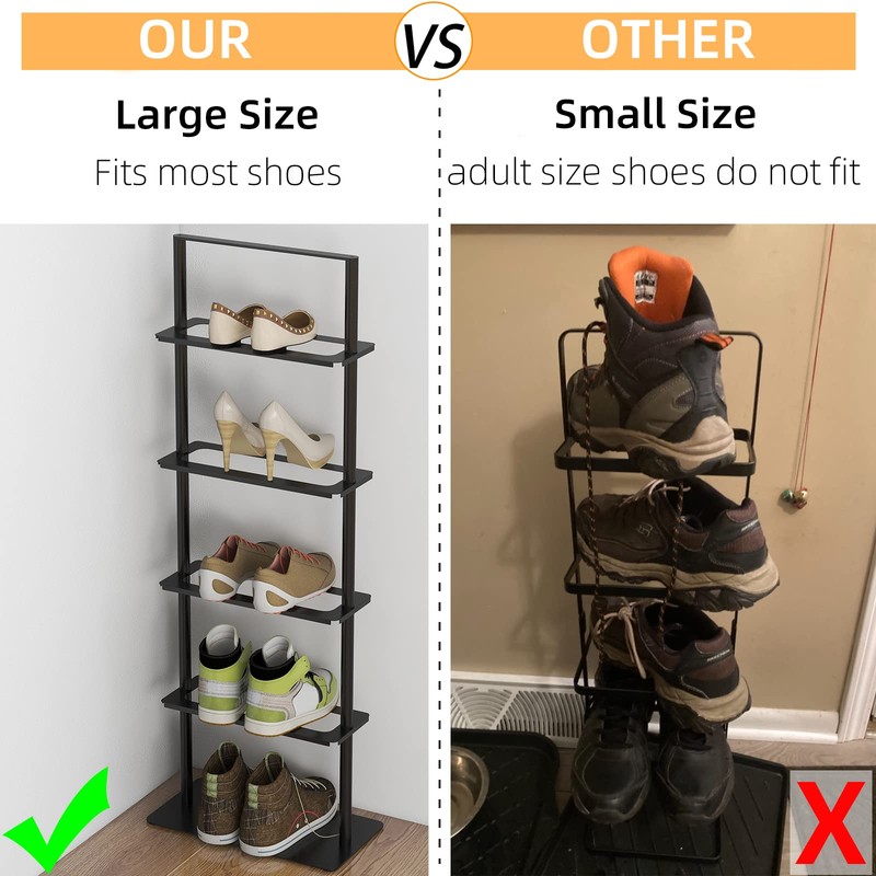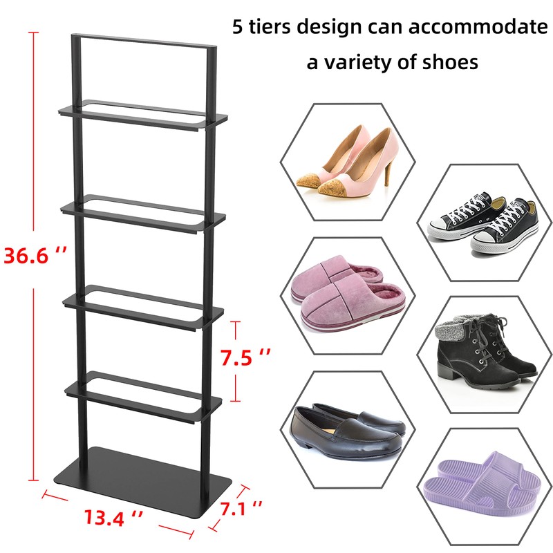- ✔【Fit for Different Shoe Height】 -- The size of this 5-layer vertical shoe rack is 7.1"W x 13.4"L x36.7"H. Each layer are 7.5" high, making it well hold flat shoes, slippers, sneakers, boots, high heels, etc.