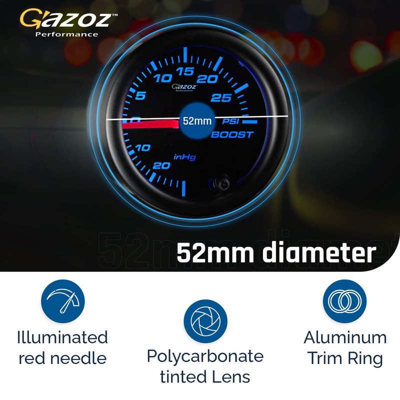 • With Gazoz’s Tinted 7 Color Series 30 PSI Boost/Vacuum Gauge you can accurately monitor boost pressure and vacuum levels to optimize efficiency