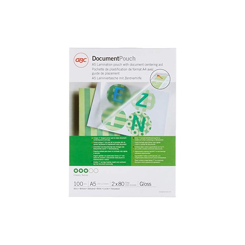 - Box contents: 1 x pack of 100 GBC A5 laminating pouches 80 micron, IB575037, for A5 format (15.4 x 21.6 cm), adaptable to non-standard sizes and shapes