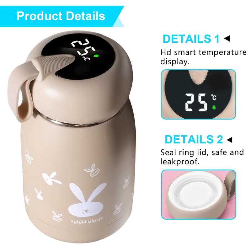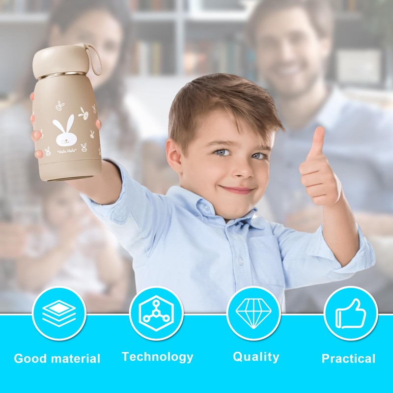 - 【Child-like style】: This thermos flask has a cute rabbit pattern. The cute shapes and bright colours are very popular with children and young girls and are ideal as a gift. The thermos bottle is equipped with ultra-light technology. The silicone handle allows children to easily hold it in their hands or take it with you.