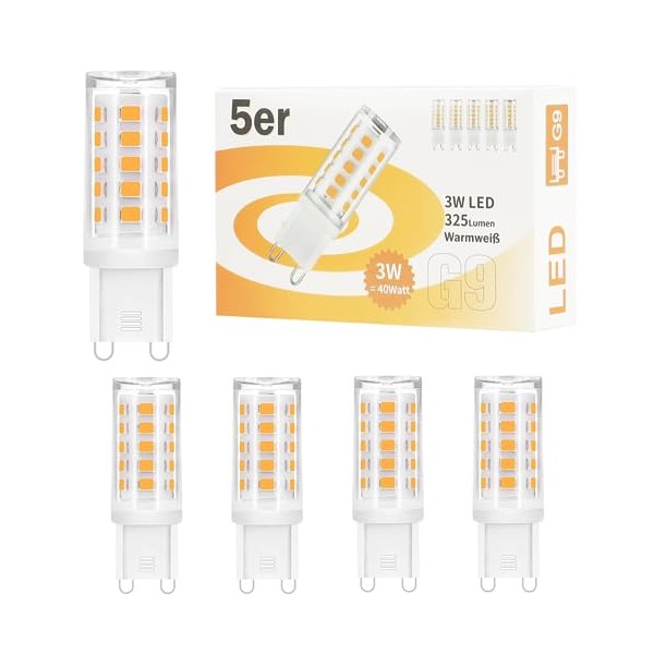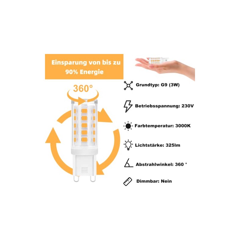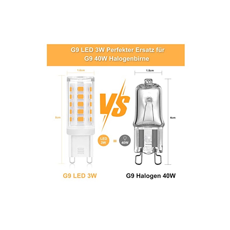 - Energy Saving: This G9 3W LED is an energy-saving light bulb, compared to conventional light bulbs, the G9 lamp only consumes 3W. In addition, the G9 light bulb can replace 40W halogen lamps, it saves 90% energy and thus saves your electricity bill. It is flicker-free and not dimmable, so it protects your eyes from light and creates a cozy atmosphere