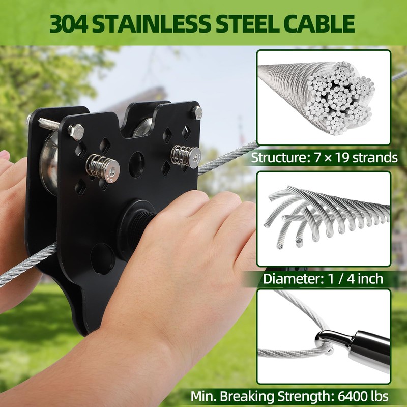 - Removable Upgraded Trolley: The zipline pulley is composed of double stainless steel components, equipped with sealed ball bearings for superior glide, wear-resistant alloy pulleys, steel side plates, and non-slip rubber grips. The trolley can be easily detached from the cable via the bottom opening, allowing for straightforward mounting and removal at any point along the zipline