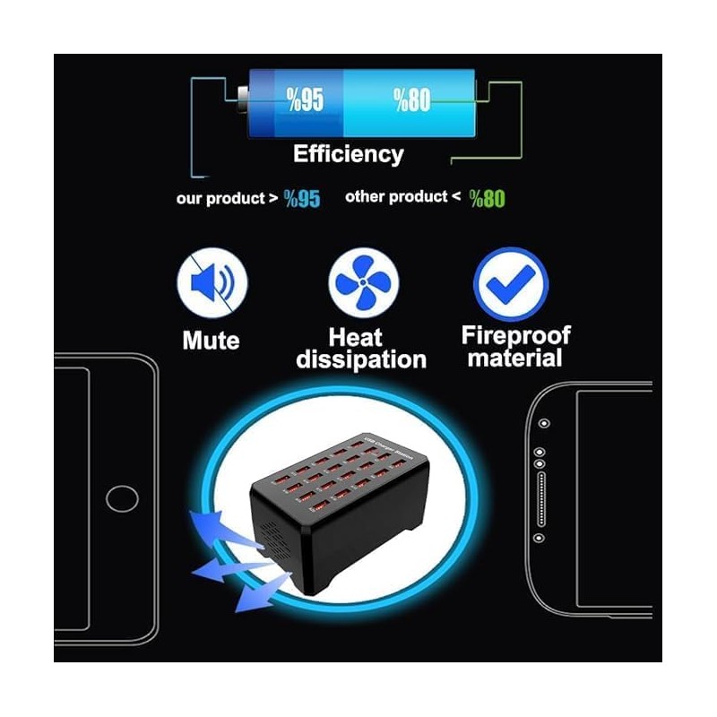 - [High-Capacity 20-Port Charging Station]-Featuring 20 dedicated USB ports, this charging station allows you to power up multiple devices at once, making it perfect for busy households, offices, or events. Its high-capacity design ensures you never run out of charging space, even with numerous devices connected simultaneously.