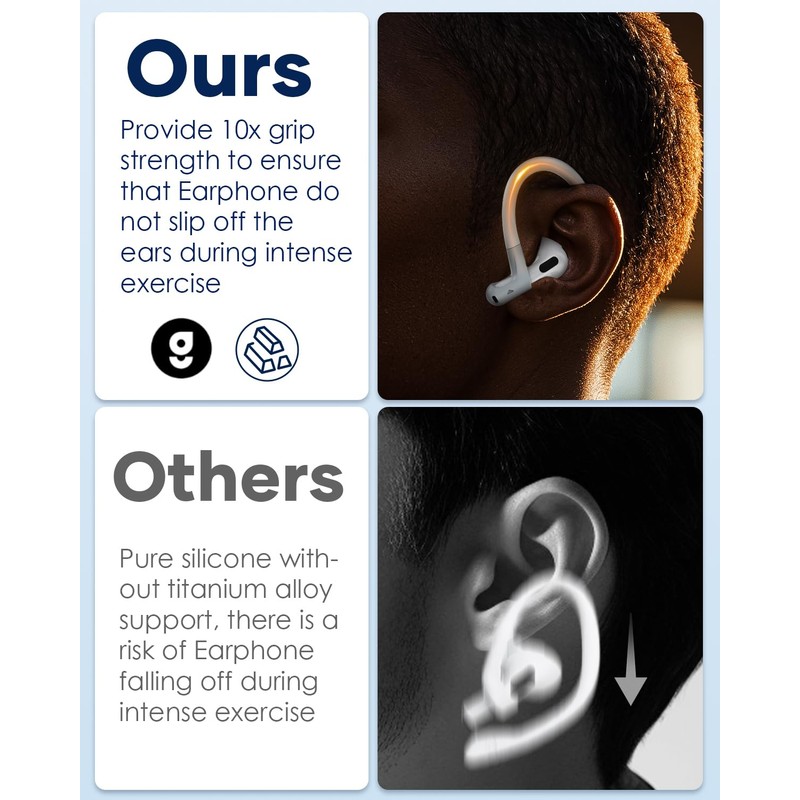 - Exceptional Durability - Crafted with extra tempered silicone and Memory Titanium Alloy, our Ear Hooks retain their shape and flexibility for rigorous workouts. They offer both durability and stability, keeping your AirPods securely in your ears without compromising comfort.