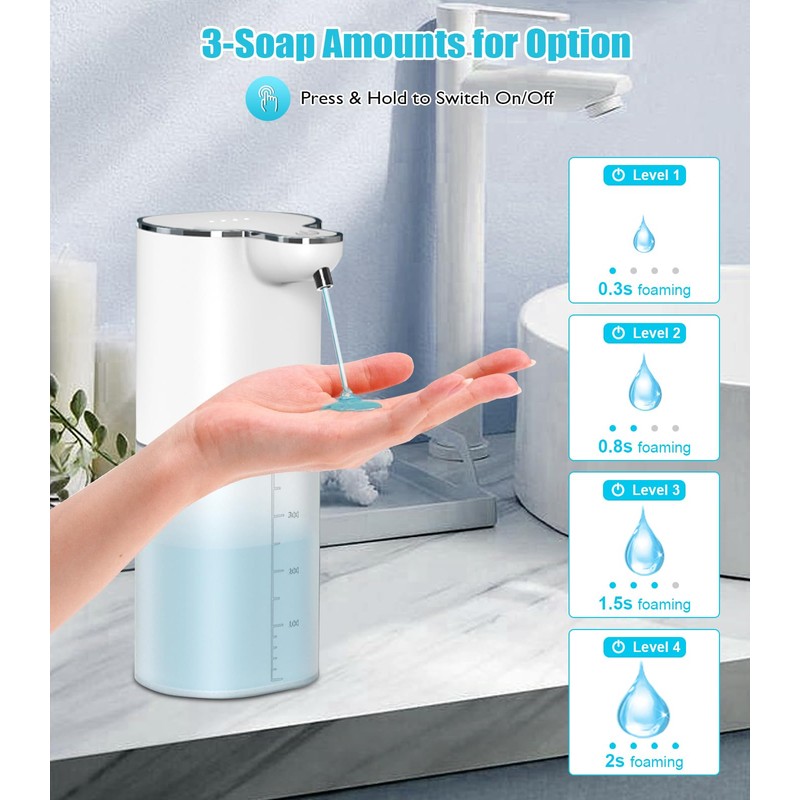 - 4 adjustable levels: This wall mounted soap dispenser is equipped with a 4-level adjustable gel output and can meet the different needs of children and adults. Simply press the on/off button to adjust the liquid time according to your needs according to 0.3s, 0.8s, 1.5s and 2s.