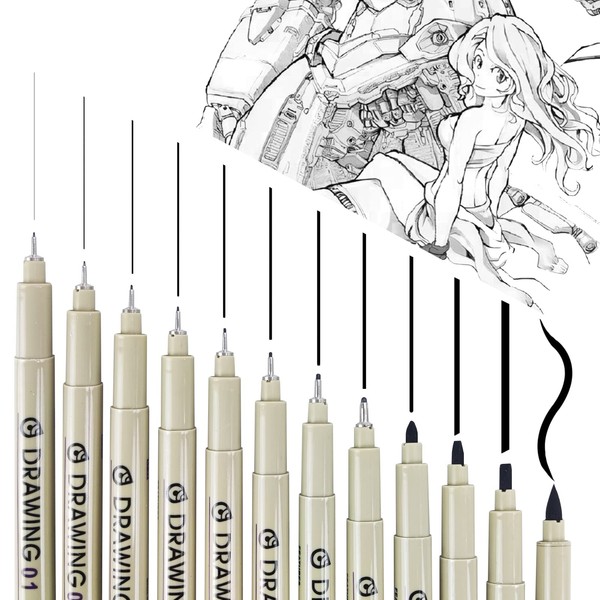 - Fine Line Drawing Art Pens Set Includes :12 black fine line pens set, with line width and cap size of 0.2mm (005), 0.25mm (01), 0.3mm (02), 0.35mm (03), 0.40mm (04), 0.45mm (05), 0.50mm (08), 0.55mm (1.0), 1.0mm (1), 2.0mm (2), 3.0mm (3), and brush (BR)