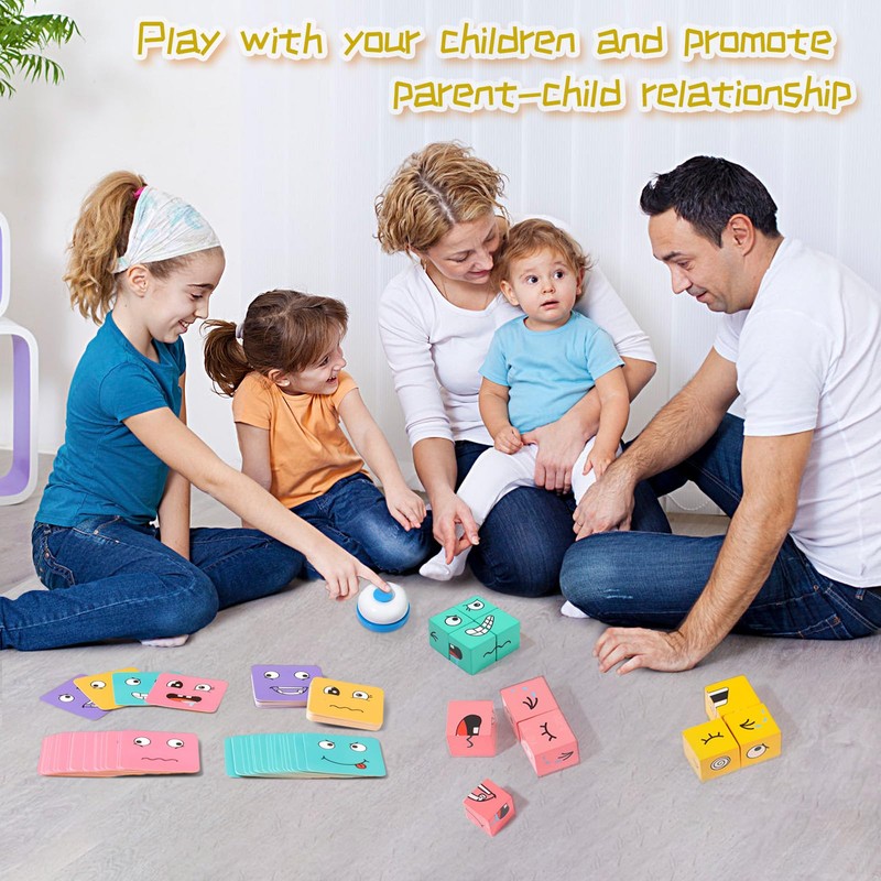 • FACE CHANGING MAGIC CUBE This wooden expression puzzle is suitable for ages 3 and up. Includes 16 square printed building blocks, 72 task cards and comes with a bell. This is a fun and challenging educational toy that allows 1-4 people to play at the same time