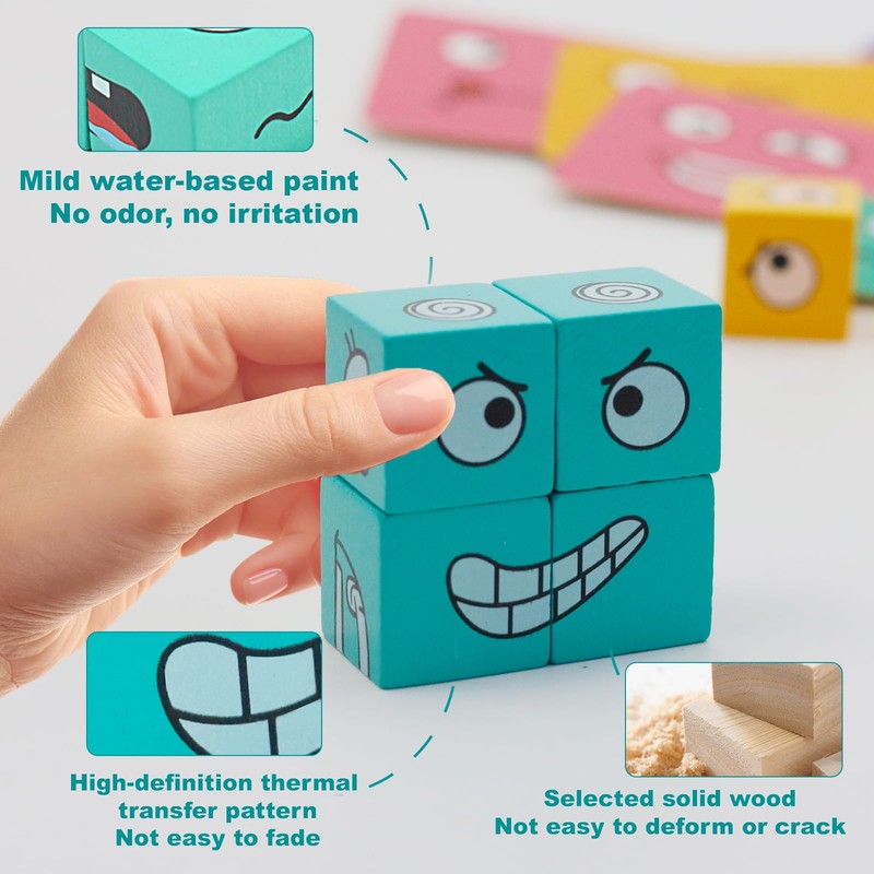 • High Quality The 3D puzzle face changing cube is made of high quality solid wood, painted with mild water-based paint, and has a heat-transferred high definition pattern. The edges are rounded and smooth, so children can play with it without any worries