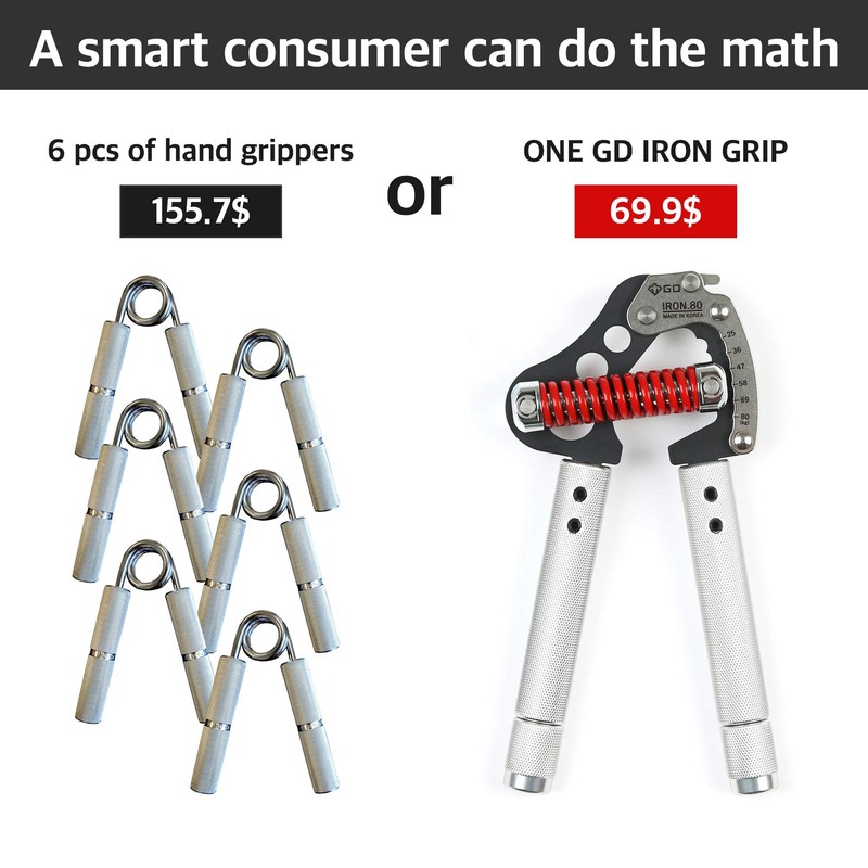 - [Incredible build quality] Made with aluminum handles, strong compressing springs, and 4T iron; GD Iron grip is sturdy as a tank. GD aims for high quality and perfect craftsmanship. This durable and safe hand strengthener is the only grip strength trainer you will ever need.