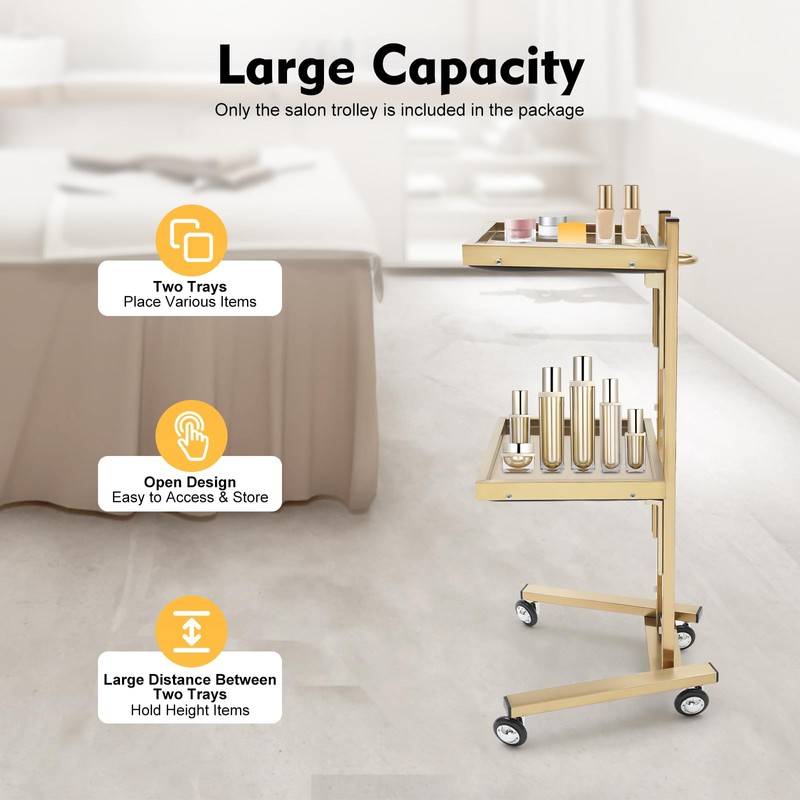 - 【Spacious 2-Tier Storage】-This 2 tier metal rolling cart provides generous space with two large trays, keeping your hairdressing tools, beauty kits, or medical supplies organized and easily accessible—ideal for any professional setting or home use.