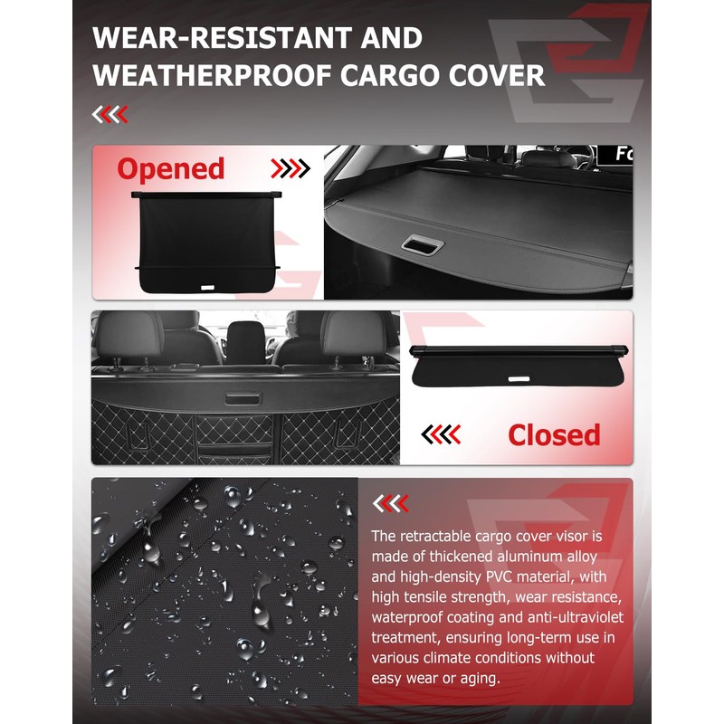 - Professional Privacy Protection ---- Our cargo security rear trunk cover focuses on cargo privacy protection. The retractable and adjustable design not only ensures that your belongings are out of sight of others, effectively protecting personal privacy and the security of valuables, but also prevents the items in the trunk from being damaged by sunlight