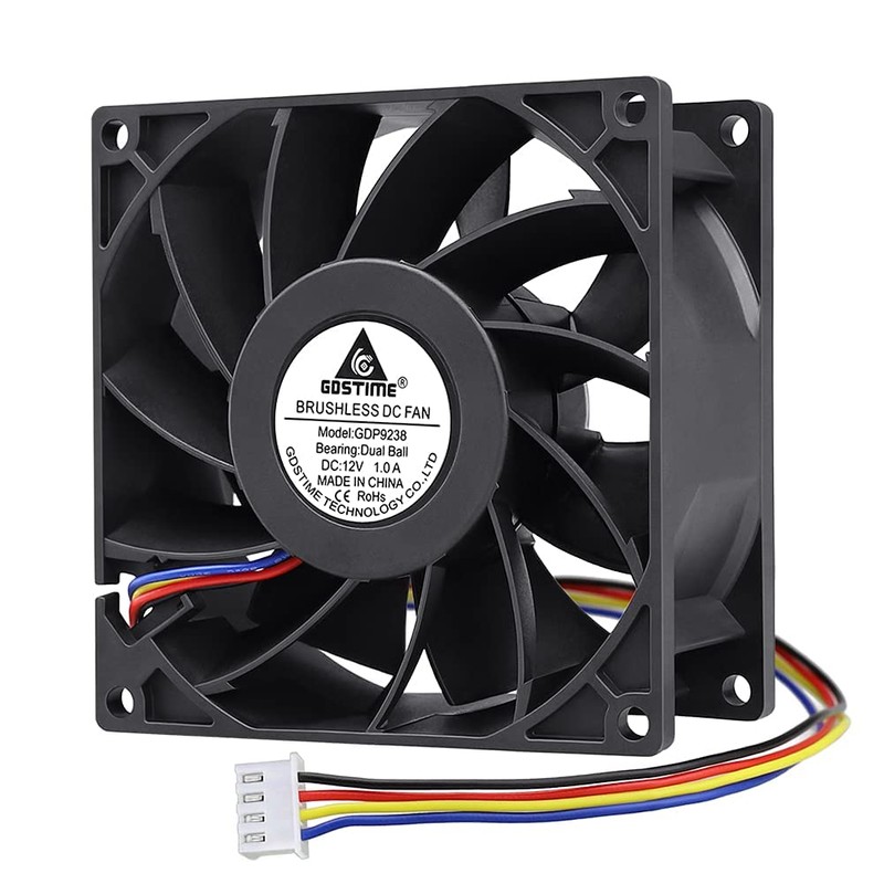 - Technical data: 92 x 92 x 38 mm; Voltage: DC 12 V; Speed: 5000 rpm; Airflow: 103.4 FM; Material: PBT plastic fan frame and blades; Lifespan: 50,000 hours at 25 °C; Connection: 4 pin; Noise: 48.5 dBA;