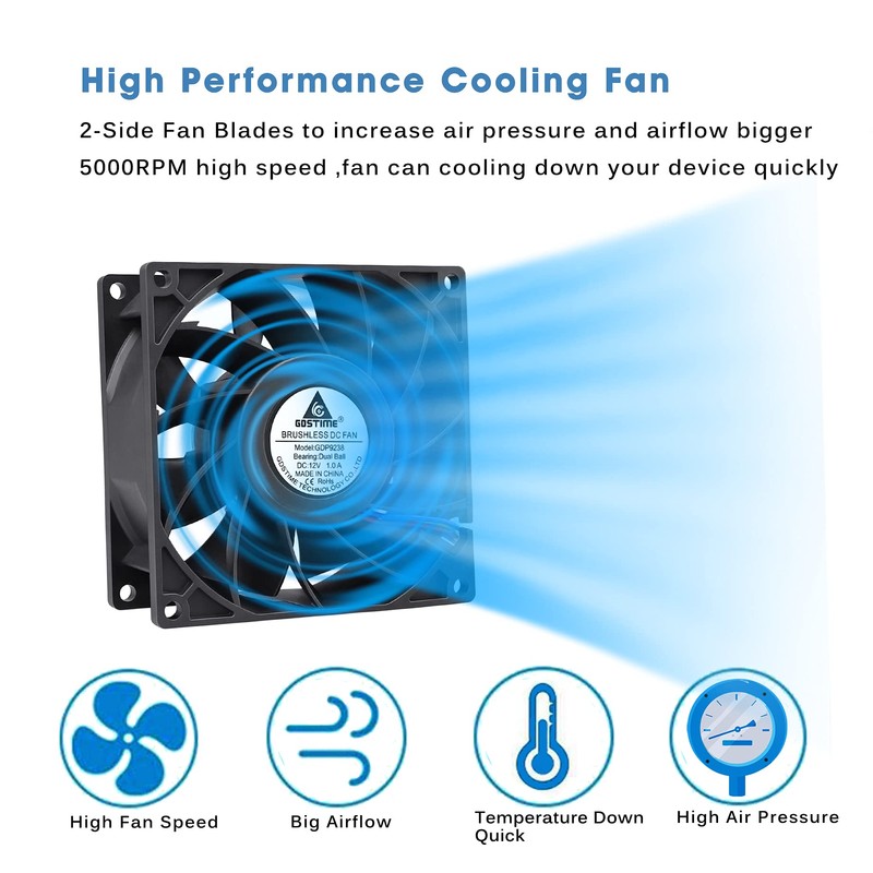 - Both side fan blades, one side fan blade moves to create a cooling airflow, fixed fan blade does not move, but designed to increase the air pressure, 5000 rpm fast speed, 103.4 CFM large ariflow, ideal for cooling server/receiver/workstation/converter/RV cabinet/projector, 12 V fan is also a good choice for fan swap Ventilation exhaust