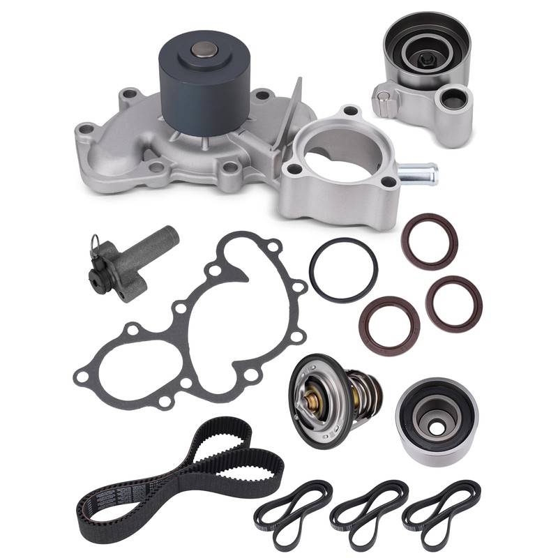 - INCLUDING: Timing Belt & 1 label, Water Pump, Water Pump Gasket, Tensioner Roller, Idler Roller, Hydraulic Tensioner, Front Camshaft Seals, Front Crankshaft Seal, Thermostat (82°C), Thermostat Gasket, Air Conditioning Belt, Power Steering Belt, Alternator Belt
