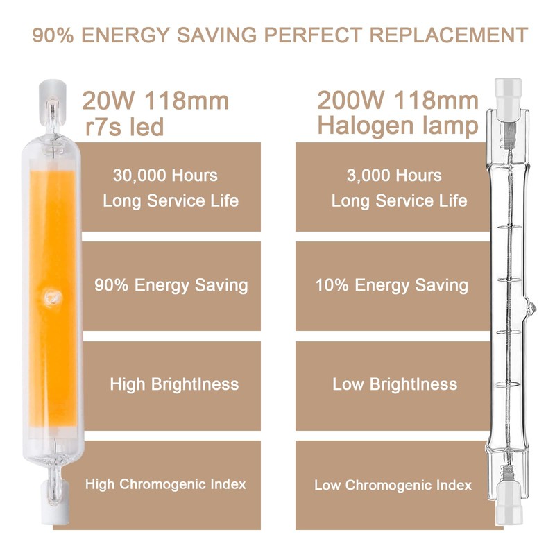 - Low energy consumption: 20 W R7S LED 118 mm dimmable lamp, perfect replacement for 200 W halogen lamps. Reduces energy consumption as 90%. Low maintenance costs and can reduce problems of frequent lamp changes