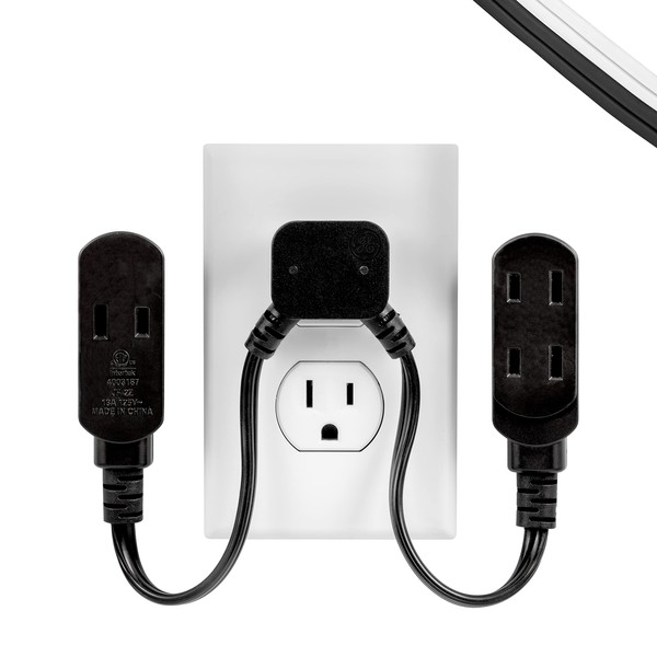 GE 10 inches Twin Extension Cord Power Strip, 6 Total Outlets, 10 inches Cord On Each Side, Power Splitter, 16 Gauge, Indoor Rated, Black, 69864