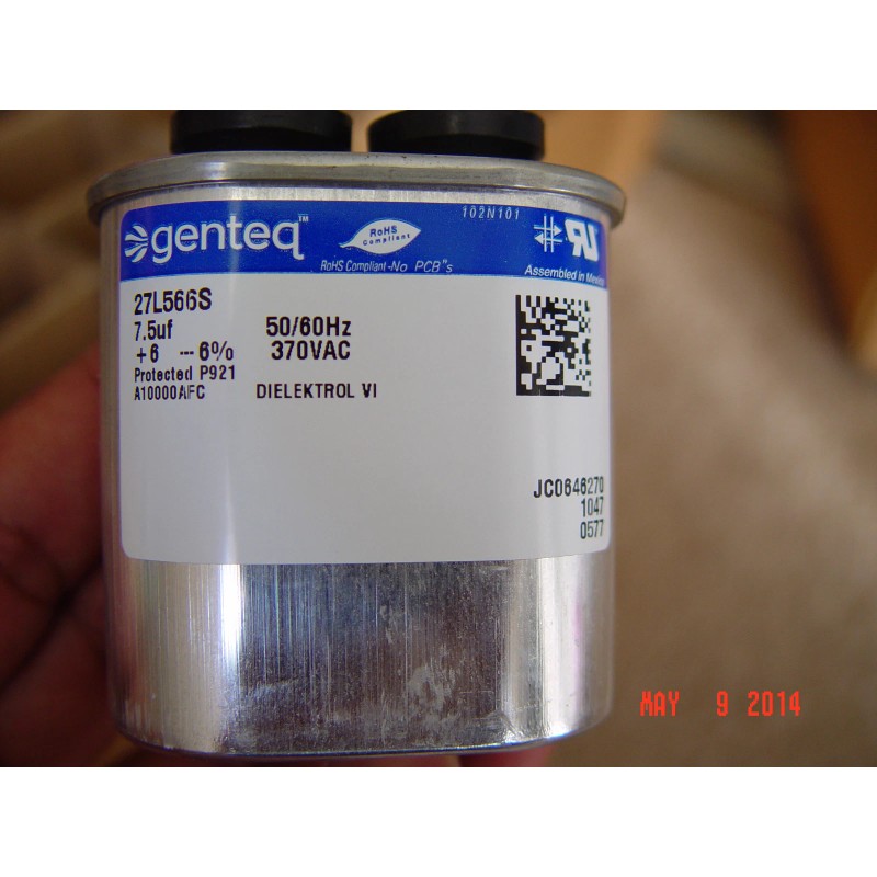 The capacitor is oval and rated at 7.5 uf MFD at 370 volt VAC 50/60 Hz.
