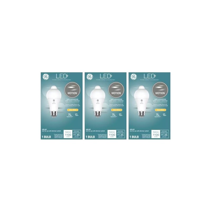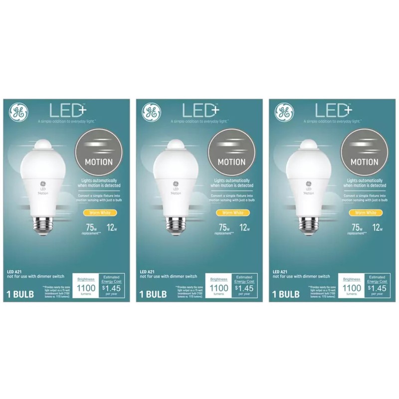 GE (3 Bulbs) LED+ Motion Sensing LED Light Bulb, 12 watts, 1100 lumens, 75 watt Replacement, Warm White, Lights Automatically When Motion is Detected, LED A21 Light Bulb