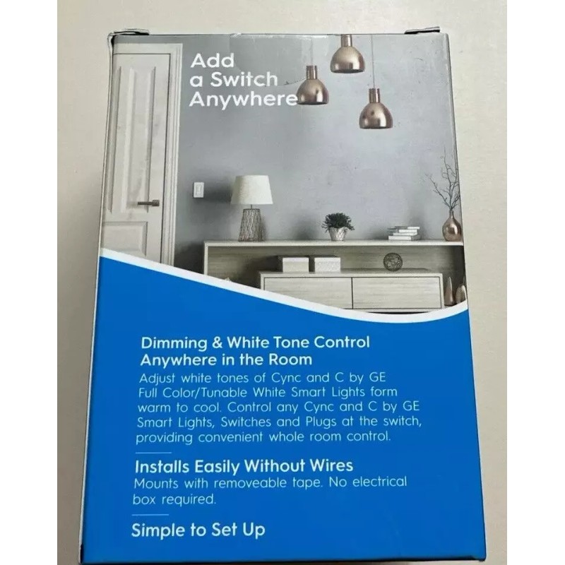 The GE Cync Wire-Free SmartLight Dimmer Switch + Color Control adds lighting touch control and white colortuning at the switch. Now you can adjust the brightness and white color of yourCync or C by GE Tunable White and Full Color Smart Bulbs while you're at theswitch. Like a wireless dimmer switch, adjust the white tones from warmer whiteto cooler white with the touch of a button. Want a switch closer to your bed orone that's reachable when you walk into your front door? Place a wireless wallswitch where there isn't a switch today with no wires or screws needed, makingit perfect for rentals or dorm rooms. The smart battery wall switch connectswirelessly to Cync and C by GE Smart Light Bulbs, Smart Plugs and SmartSwitches to provide whole-room control. You can turn lights on and off orbrighten and dim from anywhere in the room with our wireless dimmer lightswitch. The no wire switch comes with removable tape and a replaceable batterythat's rated to last over two years. Pair the Bluetooth light switch with otherCync or C by GE switches, bulbs and plugs in the Cync App and create 3-wayconnections, control electric devices like fans and space heaters, and usetouch to turn off lights on different circuits. WARNING: This product containsa lithium button/coin cell battery. Keep coin cell batteries out of reach ofchildren.