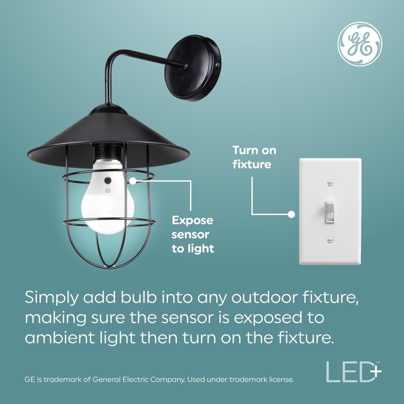 Introducing the GE LED+ Dusk to Dawn LED Outdoor Light Bulbs C all night security you can set and forget! Effortlessly blend safety, security, and style with these innovative LED outdoor bulbs that automatically brighten your surroundings from dusk to dawn ensuring safety and security around your home and business. Dusk to Dawn LED outdoor lights serve as security lights to enhance your home security by creating the illusion of occupancy when you're away. To install, simply screw the LED dusk to dawn light bulb into any standard E26 medium base socket in an outdoor fixture ensuring the automatic light sensor is exposed to ambient light then turn on the fixture and the sensor will take care of the rest no app, hub, Wi-Fi or scheduling required! GE light bulbs are energy-efficient and long-lasting, delivering bright, consistent light while minimizing energy consumption. With a lifespan of up to 22.8 years you can enjoy years of dependable performance without worrying about frequent replacements. Say goodbye to darkness and hello to energy-efficient automatic lighting solutions with GE LED+ Dusk to Dawn Outdoor Light Bulbs - your reliable partner from dusk till dawn.