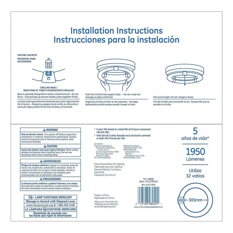 GE 33890 Cool White 12-Inch Diameter Circline Fluorescent T9 32-Wattt 33890 - FC12T9/CW GE Cool White Circline T9Ideal for office and utility use. Lasts up to 8 years! Bulb T9ANSI Code 78901-ANSI-4032-1 Base: 4-Pin (G10q), Wattage: 32 Voltage 84 Initial Lumens 1950 Color Temperature 4100 K Color Rendering Index (CRI) 60, Rated Life: 12000 hours, Product Code: 33890, Description: FC12T9/CW, UPC: 043168980401. The Primary Application: Standard . GE fluorescent lamps have become a universal standard in office and other lighting applications. The characteristics of fluorescent lamps vary widely according to the lamp type. In general, fluorescent lamps have low operating costs because theyre efficient, long living, high quality, and rapid starting. Fluorescent lamps can cost significantly less to operate over their lifetime than incandescent lamps. Life ratings for fluorescent lamps range from 6,000 to 36,000 hours based on the industry standard of 3 burning hours per start. The Light Quality GE Star coat T5 and T8 lamps offer higher color rendering and lumen maintenance of 92 percent-95 percent. Also, rapid start and instant start lamps typically start within 1 second of being turned on. Life ratings are based on lamps cycled every 3 operating hours. Lamp life is approximately 35 percent longer at 3 hours per start and 20 percent longer at 12 hours per start on programmed start ballasts as compared to standard instant start ballasts. Todos nuestros productos estan en inglés SKU 28092237976