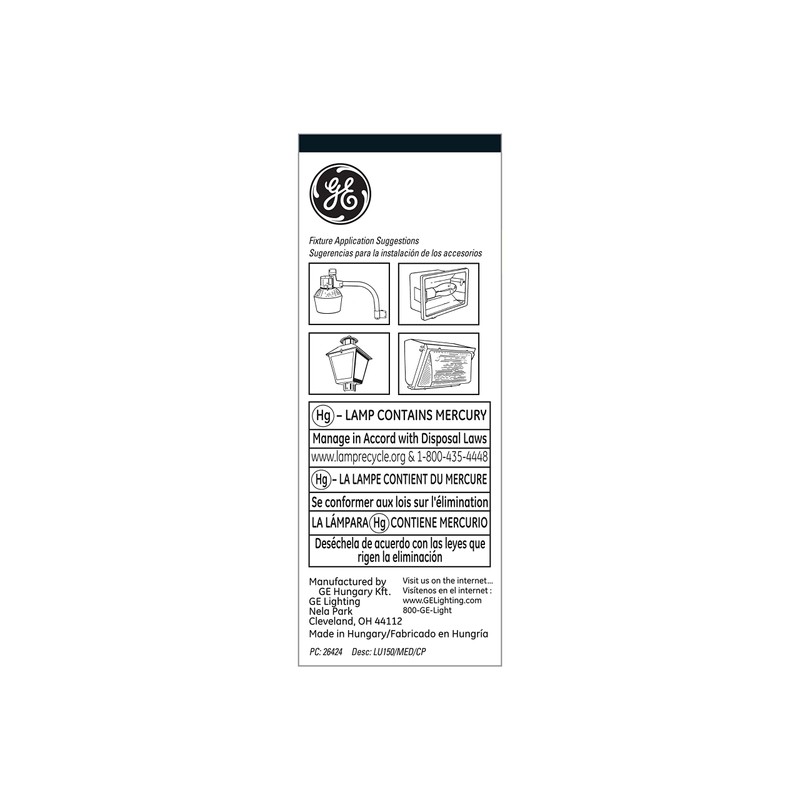GE 26424 150-Watt LUCALOX HID High Pressure Sodium MED BASE. Bulb Diameter (DIA) [Nom]: 2.125 in, Bulb Finish: Clear, Bulb Material: Hard glass, Burn Position: Universal burning position, Color Rendering Index (CRI): 22, Color Temperature: 2,000 K, Effective Arc Length: 1.570000 in, Hot Restart Time to 90 percent [Max]: 0.670 min, Initial Lumens [Nom]: 16,000.00, Lamp Enclosure Type (LET): Open or enclosed fixtures, Light Center Length (LCL): 3.500 in, Maximum Overall Length (MOL): 5.7500 in, Mean Lumens [Nom]: 14400, Mercury Content: 14.850 mg, Nominal Initial Lumens per Watt: 107, Nominal Length: 5.750 in, Open Circuit Voltage (RMS lag ballast) [Min]: 110 V, Picograms of Mercury: 43.0 pg, Product Technology: High Intensity Discharge, Rated Life [Min]: 24,000 h, Wattage: 150GE HID (High Intensity Discharge) lamps provide high efficacy and low operating cost. The HID is generally the most efficient light source. Better efficiency almost always means lower operating cost. They also have a long life. Most HID lamps have life ratings that are better than incandescent lamps and similar to fluorescent lamps. An HID lamp produces high light output from a relatively compact source. Like incandescent, it is a "point" light source, which allows for good optical control. Light bulb efficiency is measured in lumens per watt (LPW). Rated life for HID lamp life depends on the number of hours per start. The combination of high efficiency and long life makes HID an ideal light source for many commercial and industrial applications. For product questions regarding GE Lighting products, please call GE Hotline 1-800-435-4448, Monday – Friday, 8:00 a.m. - 6:00 p.m. EST Follow the recording prompts or ‘stay on the line’ to speak directly to a customer service rep.