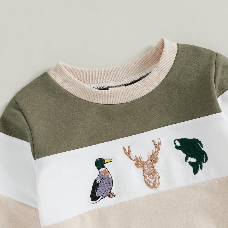 - Feature: Toddler outfits for boys, long sleeve crew neck sweatshirt, contrast color pullover top, cute elk and duck embroidery sweater shirt, ribbed cuffs and neck, elastic waist trouser with drawstring, make your baby more adorable