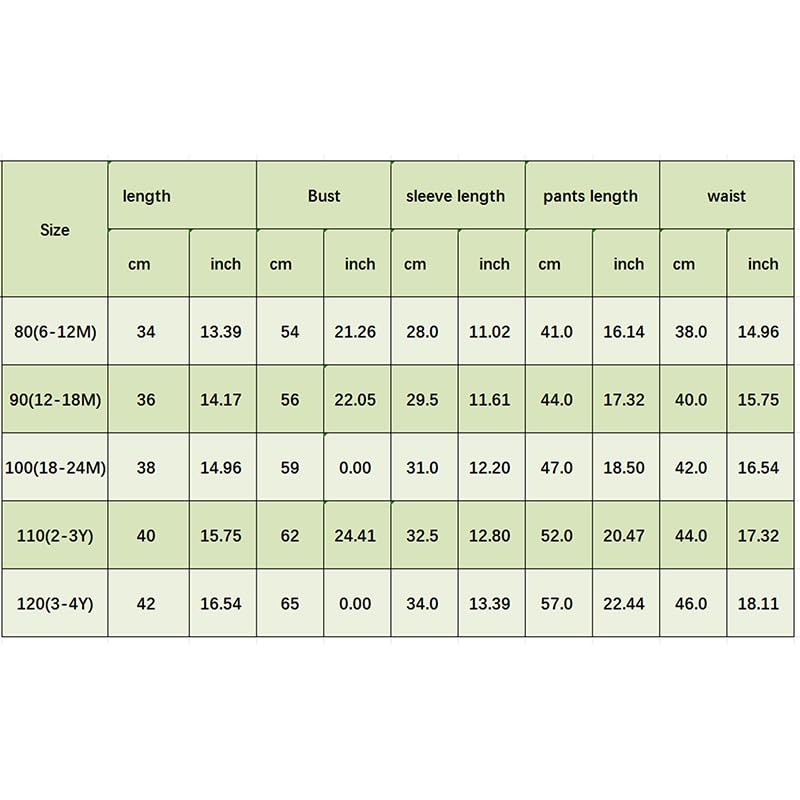 80 Tops Length: 13.39 Bust: 21.26 Sleeve: 11.02 Pants Length: 16.14 Waist: 14.96 Advised Age: 6-12 Months