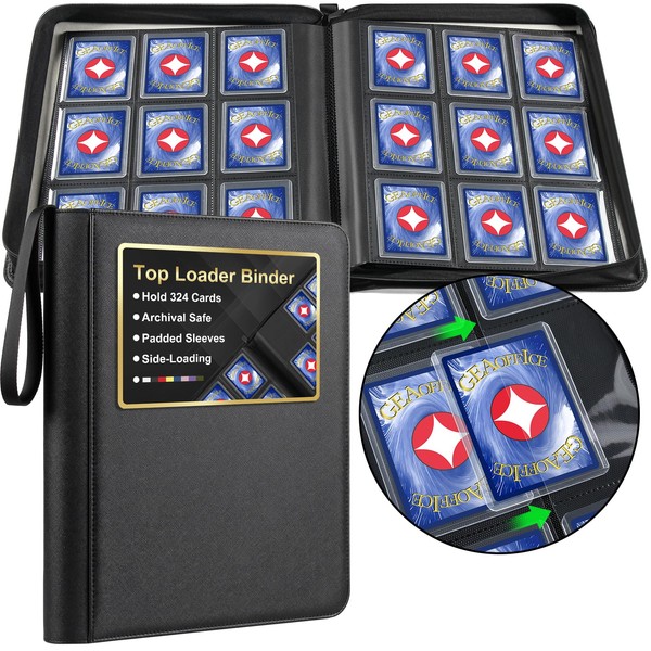 GEAoffice Top Loader Binder for Cards, Premium PU Leather 9 Pokcets Card Binder for Toploader Hold 324 Cards, Side Loading Ringless Card Album, Waterproof Card Collection Binder for 3"×4" Rigid, Black